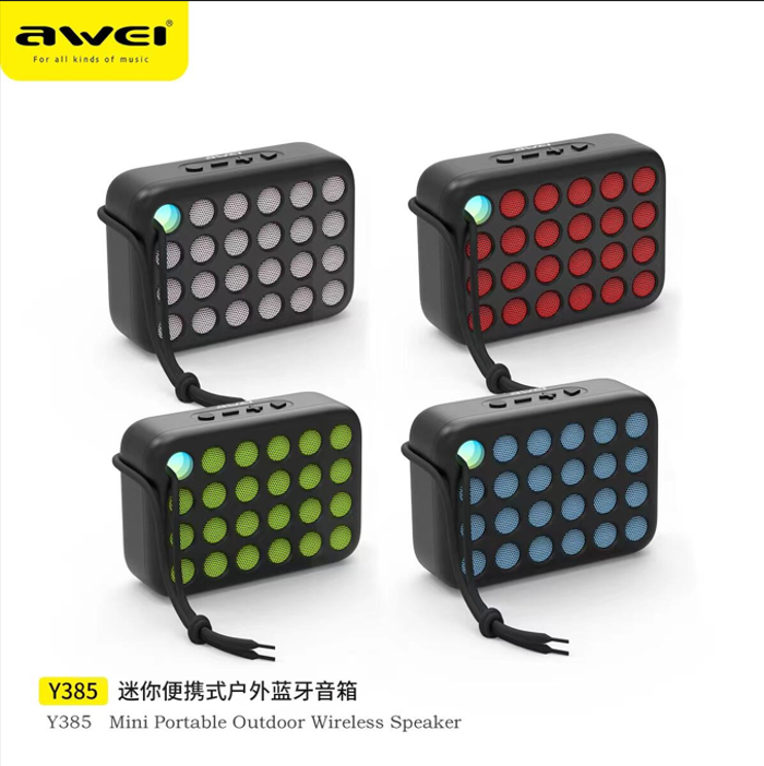 The Awei Y385 New arrival Awei TWS Speaker AWEI Y385 Home theater system speakers audio system Sound Bars. AWEI Y385 Promotional Outdoor Mini Portable Bluetooth Speaker 4W. Two ways to play Bluetooth and TF Card. Bluetooth connection, low latency connection stable transmission TF card playback, the signal is not interrupted. TWS two interconnected Enjoy Surround life. Support two audio interconnections, easy to connect two speakers to enjoy 3D stereo surround sound. Long Battery life Listen to the music. Built-in 500mAh large battery, can play continuously for 5 to 6 hours, music listening is more long-lasting.