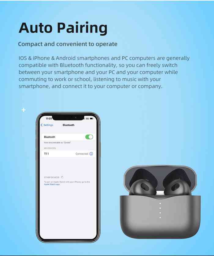 Open the charging case, they will automatically connect to each other, then you can easily enter your phone's or PC's Bluetooth settings to pair the earbuds in one step.